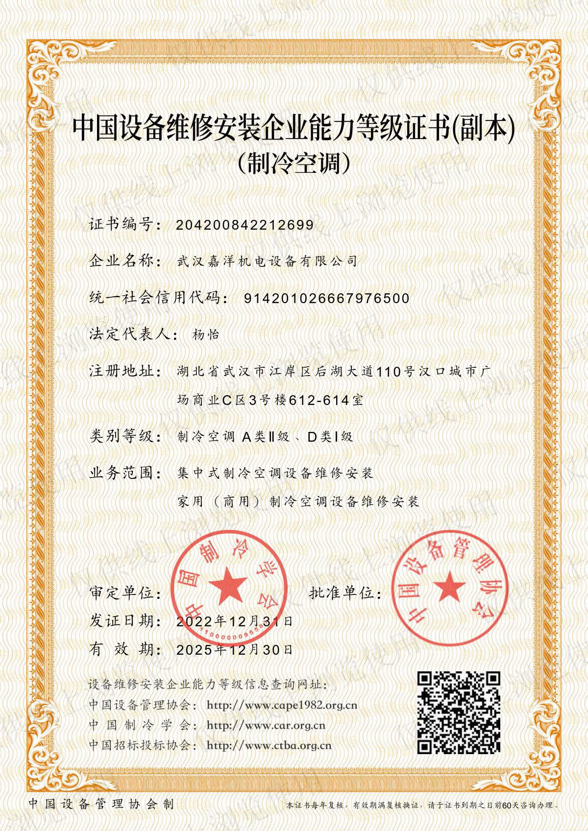 日前,嘉洋機電榮獲中國設(shè)備維修安裝企業(yè)能力等級證書(制冷空調(diào)),這是繼嘉洋機電升級建筑機電安裝專業(yè)承包壹級資質(zhì)之后的又一重量級能力等級證書。