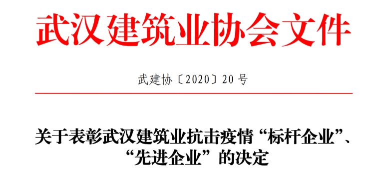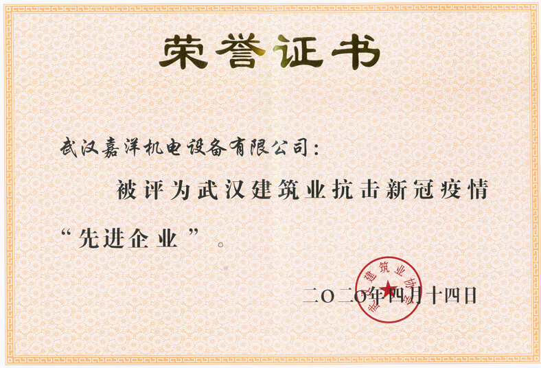 武漢嘉洋機(jī)電設(shè)備有限公司榮獲武漢建筑業(yè)抗擊疫情“先進(jìn)企業(yè)”稱號(hào)