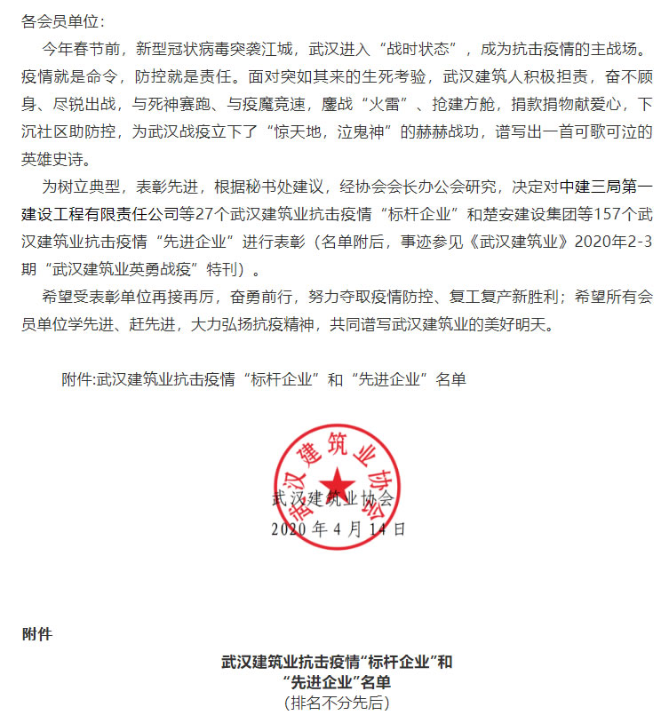 近日,武漢建筑業(yè)協(xié)會(huì)為樹立典型,表彰先進(jìn),根據(jù)秘書處建議,經(jīng)協(xié)會(huì)會(huì)長(zhǎng)辦公會(huì)研究,表彰一批抗擊疫情“標(biāo)桿企業(yè)”和“先進(jìn)企業(yè)”,決定對(duì)27個(gè)武漢建筑業(yè)抗擊疫情“標(biāo)桿企業(yè)”和157個(gè)武漢建筑業(yè)抗擊疫情“先進(jìn)企業(yè)”進(jìn)行表彰,武漢嘉洋機(jī)電設(shè)備有限公司榮獲武漢建筑業(yè)抗擊疫情“先進(jìn)企業(yè)”稱號(hào)。