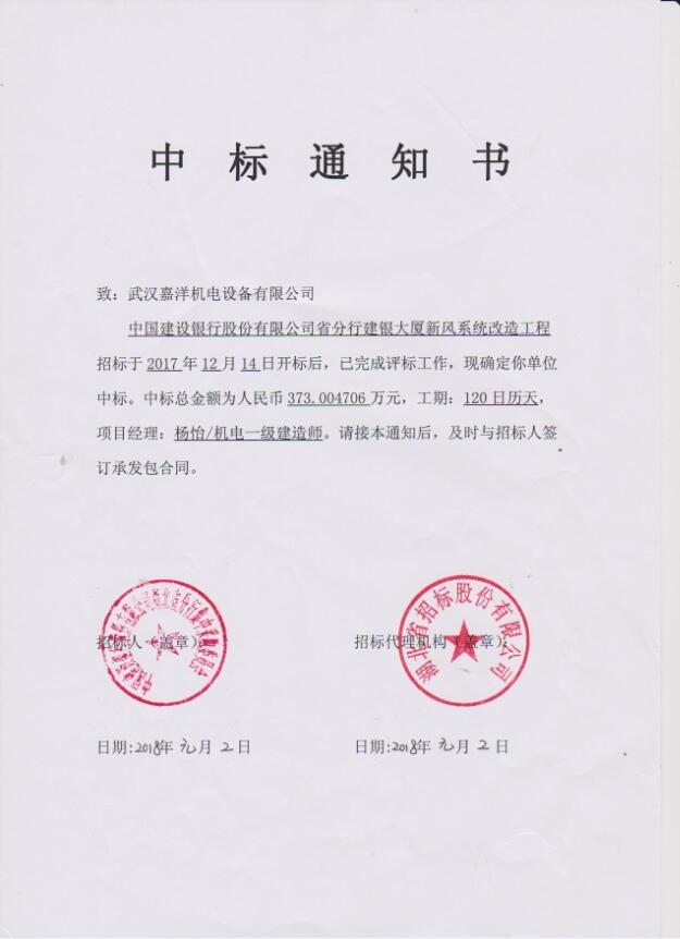 熱烈祝賀武漢嘉洋機(jī)電設(shè)備有限公司在中國建設(shè)銀行股份有限公司省分行建銀大廈新風(fēng)系統(tǒng)改造工程項(xiàng)目中中標(biāo),在此向參與此次投標(biāo)的同志們表示熱烈祝賀,同時(shí)期望武漢嘉洋機(jī)電銷售成員再接再勵(lì),再創(chuàng)業(yè)績。