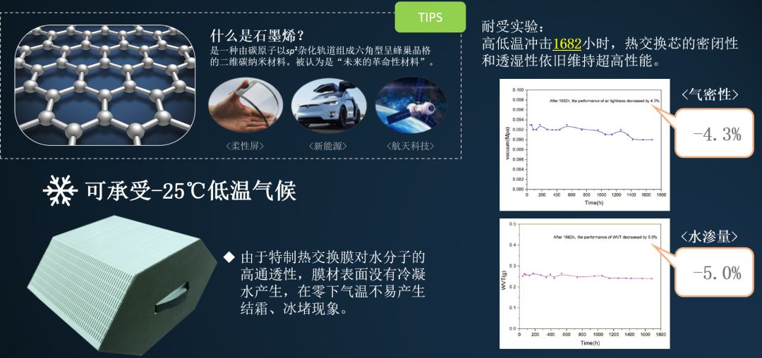 石墨烯膜材具備高導(dǎo)熱性能保證了石墨烯芯塊顯熱回收效率,同時(shí)由于膜材的親水性及水分子的高通透性能保證了石墨烯芯塊的潛熱回收效率。